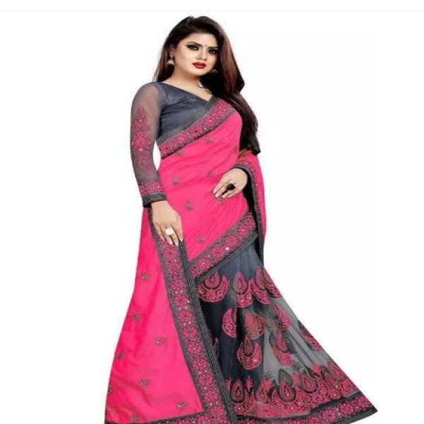 Half and half Net Pink Mirror Work Saree With Blouse